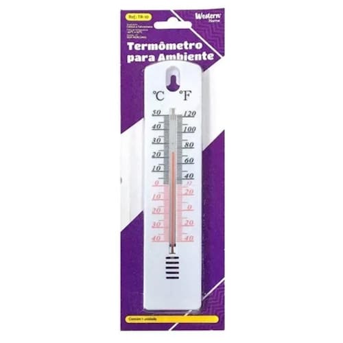 Termometro de alta qualidade na cor branca, feito com plástico, querosene e vidro. Graduação celsius e fahrenheit, com faixa de temperatura de 40c a + 50c, divisão 1c sem mercúrio.