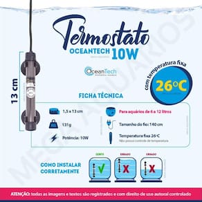 Termostato com aquecedor OceanTech 10W com temperatura fixa 26ºC para aquários pequenos de 6 a 12L - acompanha termômetro adesivo Para manter a temperatura estável e o bem-estar dos seus peixes, conte com o melhor equipamento do mercado, os termostatos com aquecedor OceanTech para aquários, são fabricados com materiais de alta qualidade, sua resistência é feita de puro níquel-cromo, que além de não enferrujar, possibilita rápida transferência de calor. Características: Resistência de puro níquel-cromo - não enferruja Tubo de quartzo de alta performance Temperatura fixa 26ºC - não possui ajuste de temperatura - o equipamento ajustara a temperatura automaticamente sempre que a temperatura da água estiver a baixo de em 26ºC. Protetor plástico para a ponta Ventosas para fixação no vidro Rápida transferência de calor Operação constante Totalmente submerso e à prova dágua Fácil instalação e manutenção Server para aquários de água doce, plantado ou marinhos Especificações técnicas: Marca: OceanTech Modelo: J16-10w Potência: 10W Voltagem: Escolha a voltagem no botão do anúncio, próximo ao botão comprar Ajuste de temperatura automático a 26ºC Peso: 131g Tamanho: 1,5 x 13cm larg x alt Tamanho do fio: 140cm Para aquários de 6 a 12 litros Aquecedor e Termostato automático liga e desliga para atingir a temperatura de 26ºC Conteúdo da embalagem 1 termostato com aquecedor 1 protetor de plástico de ponta 2 ventosas para fixação 1 termômetro externo adesivo Nota: Nunca ligue esse equipamento fora da água Se notar qualquer dano no cabo de energia ou no vidro, não utilizar o produto, pois haverá risco de choque elétrico. : 1 ano pelo fabricante, 3 meses pelo revendedor. apenas para defeito de fabricação. Dicas de uso: Use o termostato na vertical Instale-o em local onde há circulação de água Mantenha-o totalmente submerso Antes de ligar o equipamento: 1- verifique a temperatura ideal para a espécie mantida no seu aquário 2- deixe o equipamento desligado dentro da água por 30min para evitar choques térmicos IMPORTANTE: Sempre que necessitar realizar a limpeza no equipamento e ou manuseá-lo, desligue-o cerca de 30 minutos antes. Após a manutenção, antes de ligar o equipamento, deixe-o desligado dentro da água por 30 minutos Como instalar o termostato com aquecedor Oceantech: Limpe a parte de dentro do aquário onde será fixado o termostato Coloque na posição vertical e fixe com as ventosas no vidro Deixe-o aclimatando por cerca de 30min evitando choque térmico Ligue-o na tomada certifique-se que a voltagem do produto é a mesma da rede . Manutenção: Realize a limpeza do termostato a cada 30 dias Sempre desligue o equipamento de 20 a 30 minutos antes de retirá-lo do aquário Lave-o em água corrente e não utilize produtos abrasivos. Serve para piscina Não serve. Serve para chocadeira Não serve. Serve para aqua-terrário Serve, desde que tenha no mínimo 6L de água e que o equipamento fique totalmente submerso. Obrigado pela visita e boas compras ATENÇÃO Nossas imagens e textos são registrados e com direito de uso autoral controlado e reservado a essa loja e as lojas parceiras devidamente autorizadas em contrato.