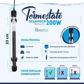 Termostato com aquecedor OceanTech 200W com marcação de temperatura lago ou aquário de até 250L - acompanha termômetro adesivo Para manter a temperatura estável e o bem-estar dos seus peixes, conte com o melhor equipamento do mercado, os termostatos com aquecedor OceanTech para aquários, são fabricados com materiais de alta qualidade, sua resistência é feita de puro níquel-cromo, que além de não enferrujar, possibilita rápida transferência de calor. Características: Resistência de puro níquel-cromo - não enferruja Tubo de quartzo de alta performance Painel de ajuste de temperatura Botão de controle de temperatura giratório Protetor plástico para a ponta Rápida transferência de calor Operação constante Totalmente submerso e à prova dágua Fácil instalação e manutenção Possui LED que indica quando o aquecedor está ligado Server para aquários de água doce ou marinhos Aquecedor e Termostato automático liga e desliga para atingir a temperatura regulada Compre nesse anúncio diretamente com um revendedor oficial OceanTech. Especificações técnicas: Marca: OceanTech Modelo: Warmer X-5 Potência: 200W Voltagem: escola a voltagem na lateral do anúncio Ajuste de temperatura entre 20ºC a 34ºC Peso: 230g Tamanho: 2 x 33 cm larg x alt Tamanho do fio: 115cm Para aquários de 150 a 250 litros Conteúdo da embalagem 1 termostato com aquecedor 1 protetor de plástico de ponta 2 ventosas para fixação 1 termômetro externo adesivo Nota: Nunca ligue esse equipamento fora da água Se notar qualquer dano no cabo de energia, não utilizar o produto, pois haverá risco de choque elétrico. : 1 ano pelo fabricante, 3 meses pelo revendedor. apenas para defeito de fabricação. Dicas de uso: Use o termostato na vertical Instale-o em local onde há circulação de água Mantenha-o totalmente submerso Antes de ligar o equipamento, verifique a temperatura ideal para a espécie mantida no seu aquário Regular a temperatura desejada por meio do botão giratório. Como instalar o termostato Oceantech Limpe a parte de dentro do aquário onde será fixado o termostato Coloque na posição vertical e fixe com as ventosas no vidro Deixe-o aclimatando por cerca de 15min evitando choque térmico Ligue-o na tomada certifique-se que a voltagem do produto é a mesma da rede . Funcionamento: Sempre que o sensor do equipamento detectar na água uma temperatura abaixo do ajustado no painel, o aquecedor ligará automaticamente, e desligará quanto atingir a temperatura desejada. Manutenção: Realize a limpeza do termostato a cada 30 dias Sempre desligue o equipamento de 15 a 20 minutos antes de retirá-lo do aquário Lave-o em água corrente e não utilize produtos abrasivos. Serve para piscina Não serve. Serve para chocadeira Não serve. Serve para aqua-terrário Não serve. Posso colocar na horizontal O fabricante aconselha apenas uso na vertical. Obrigado pela visita e boas compras ATENÇÃO Nossas imagens e textos são registrados e com direito de uso autoral controlado e reservado a essa loja e as lojas parceiras devidamente autorizadas em contrato. Marca: Não Informado