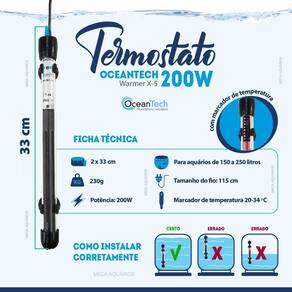 Termostato com aquecedor OceanTech 200W com marcação de temperatura lago ou aquário de até 250L - acompanha termômetro adesivo Para manter a temperatura estável e o bem-estar dos seus peixes, conte com o melhor equipamento do mercado, os termostatos com aquecedor OceanTech para aquários, são fabricados com materiais de alta qualidade, sua resistência é feita de puro níquel-cromo, que além de não enferrujar, possibilita rápida transferência de calor. Características: Resistência de puro níquel-cromo - não enferruja Tubo de quartzo de alta performance Painel de ajuste de temperatura Botão de controle de temperatura giratório Protetor plástico para a ponta Rápida transferência de calor Operação constante Totalmente submerso e à prova dágua Fácil instalação e manutenção Possui LED que indica quando o aquecedor está ligado Server para aquários de água doce ou marinhos Aquecedor e Termostato automático liga e desliga para atingir a temperatura regulada Compre nesse anúncio diretamente com um revendedor oficial OceanTech. Especificações técnicas: Marca: OceanTech Modelo: Warmer X-5 Potência: 200W Voltagem: escola a voltagem na lateral do anúncio Ajuste de temperatura entre 20ºC a 34ºC Peso: 230g Tamanho: 2 x 33 cm larg x alt Tamanho do fio: 115cm Para aquários de 150 a 250 litros Conteúdo da embalagem 1 termostato com aquecedor 1 protetor de plástico de ponta 2 ventosas para fixação 1 termômetro externo adesivo Nota: Nunca ligue esse equipamento fora da água Se notar qualquer dano no cabo de energia, não utilizar o produto, pois haverá risco de choque elétrico. : 1 ano pelo fabricante, 3 meses pelo revendedor. apenas para defeito de fabricação. Dicas de uso: Use o termostato na vertical Instale-o em local onde há circulação de água Mantenha-o totalmente submerso Antes de ligar o equipamento, verifique a temperatura ideal para a espécie mantida no seu aquário Regular a temperatura desejada por meio do botão giratório. Como instalar o termostato Oceantech Limpe a parte de dentro do aquário onde será fixado o termostato Coloque na posição vertical e fixe com as ventosas no vidro Deixe-o aclimatando por cerca de 15min evitando choque térmico Ligue-o na tomada certifique-se que a voltagem do produto é a mesma da rede . Funcionamento: Sempre que o sensor do equipamento detectar na água uma temperatura abaixo do ajustado no painel, o aquecedor ligará automaticamente, e desligará quanto atingir a temperatura desejada. Manutenção: Realize a limpeza do termostato a cada 30 dias Sempre desligue o equipamento de 15 a 20 minutos antes de retirá-lo do aquário Lave-o em água corrente e não utilize produtos abrasivos. Serve para piscina Não serve. Serve para chocadeira Não serve. Serve para aqua-terrário Não serve. Posso colocar na horizontal O fabricante aconselha apenas uso na vertical. Obrigado pela visita e boas compras ATENÇÃO Nossas imagens e textos são registrados e com direito de uso autoral controlado e reservado a essa loja e as lojas parceiras devidamente autorizadas em contrato. Marca: Não Informado Ean: 7793299780564