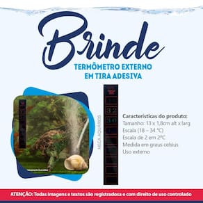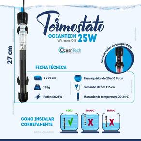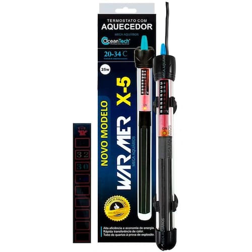 Termostato com aquecedor OceanTech 25W com marcação de temperatura lago ou aquário de até 30L - acompanha termômetro adesivo Para manter a temperatura estável e o bem-estar dos seus peixes, conte com o melhor equipamento do mercado, os termostatos com aquecedor OceanTech para aquários, são fabricados com materiais de alta qualidade, sua resistência é feita de puro níquel-cromo, que além de não enferrujar, possibilita rápida transferência de calor. Características: Resistência de puro níquel-cromo - não enferruja Tubo de quartzo de alta performance Painel de ajuste de temperatura Botão de controle de temperatura giratório Protetor plástico para a ponta Rápida transferência de calor Operação constante Totalmente submerso e à prova dágua Fácil instalação e manutenção Possui LED que indica quando o aquecedor está ligado Server para aquários de água doce ou marinhos Compre nesse anúncio diretamente com um revendedor oficial OceanTech. Especificações técnicas: Marca: OceanTech Modelo: Warmer X-5 Potência: 25W Ajuste de temperatura entre 20ºC a 34ºC Peso: 195g Tamanho: 2 x 27 cm larg x alt Tamanho do fio: 115cm Para aquários de 20 a 30 litros Aquecedor e Termostato automático liga e desliga para atingir a temperatura regulada Conteúdo da embalagem 1 termostato com aquecedor 1 protetor de plástico de ponta 2 ventosas para fixação 1 termômetro externo adesivo Nota: Nunca ligue esse equipamento fora da água Se notar qualquer dano no cabo de energia, não utilizar o produto, pois haverá risco de choque elétrico. : 1 ano pelo fabricante, 3 meses pelo revendedor. apenas para defeito de fabricação. Dicas de uso: Use o termostato na vertical Instale-o em local onde há circulação de água Mantenha-o totalmente submerso Antes de ligar o equipamento, verifique a temperatura ideal para a espécie mantida no seu aquário Regular a temperatura desejada por meio do botão giratório. Como instalar o termostato Oceantech Limpe a parte de dentro do aquário onde será fixado o termostato Coloque na posição vertical e fixe com as ventosas no vidro Deixe-o aclimatando por cerca de 15min evitando choque térmico Ligue-o na tomada certifique-se que a voltagem do produto é a mesma da rede . Funcionamento: Sempre que o sensor do equipamento detectar na água uma temperatura abaixo do ajustado no painel, o aquecedor ligará automaticamente, e desligará quanto atingir a temperatura desejada. Manutenção: Realize a limpeza do termostato a cada 30 dias Sempre desligue o equipamento de 15 a 20 minutos antes de retirá-lo do aquário Lave-o em água corrente e não utilize produtos abrasivos. Serve para piscina Não serve. Serve para chocadeira Não serve. Serve para aqua-terrário Não serve. Posso colocar na horizontal O fabricante aconselha apenas uso na vertical. Obrigado pela visita e boas compras ATENÇÃO Nossas imagens e textos são registrados e com direito de uso autoral controlado e reservado a essa loja e as lojas parceiras devidamente autorizadas em contrato.