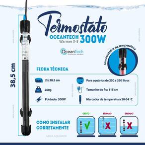 Termostato com aquecedor OceanTech 300W com marcação de temperatura lago ou aquário de até 350L - acompanha termômetro adesivo Para manter a temperatura estável e o bem-estar dos seus peixes, conte com o melhor equipamento do mercado, os termostatos com aquecedor OceanTech para aquários, são fabricados com materiais de alta qualidade, sua resistência é feita de puro níquel-cromo, que além de não enferrujar, possibilita rápida transferência de calor. Características: Resistência de puro níquel-cromo - não enferruja Tubo de quartzo de alta performance Painel de ajuste de temperatura Botão de controle de temperatura giratório Protetor plástico para a ponta Rápida transferência de calor Operação constante Totalmente submerso e à prova dágua Fácil instalação e manutenção Possui LED que indica quando o aquecedor está ligado Server para aquários de água doce ou marinhos Aquecedor e Termostato automático liga e desliga para atingir a temperatura regulada . Compre nesse anúncio diretamente com um revendedor oficial OceanTech. Especificações técnicas: Marca: OceanTech Modelo: Warmer X-5 Potência: 300W Ajuste de temperatura entre 20ºC a 34ºC Peso: 260g Tamanho: 2 x 38,5 cm larg x alt Tamanho do fio: 115cm Para aquários de 250 a 350 litros. Conteúdo da embalagem 1 termostato com aquecedor 1 protetor de plástico de ponta 2 ventosas para fixação 1 termômetro externo adesivo. Nota: Nunca ligue esse equipamento fora da água Se notar qualquer dano no cabo de energia, não utilizar o produto, pois haverá risco de choque elétrico. : 1 ano pelo fabricante, 3 meses pelo revendedor. apenas para defeito de fabricação. Dicas de uso: Use o termostato na vertical Instale-o em local onde há circulação de água Mantenha-o totalmente submerso Antes de ligar o equipamento, verifique a temperatura ideal para a espécie mantida no seu aquário Regular a temperatura desejada por meio do botão giratório. Como instalar o termostato Oceantech Limpe a parte de dentro do aquário onde será fixado o termostato Coloque na posição vertical e fixe com as ventosas no vidro Deixe-o aclimatando por cerca de 15min evitando choque térmico Ligue-o na tomada certifique-se que a voltagem do produto é a mesma da rede . Funcionamento: Sempre que o sensor do equipamento detectar na água uma temperatura abaixo do ajustado no painel, o aquecedor ligará automaticamente, e desligará quanto atingir a temperatura desejada. Manutenção: Realize a limpeza do termostato a cada 30 dias Sempre desligue o equipamento de 15 a 20 minutos antes de retirá-lo do aquário Lave-o em água corrente e não utilize produtos abrasivos. Serve para piscina Não serve. Serve para chocadeira Não serve. Serve para aqua-terrário Não serve. Posso colocar na horizontal O fabricante aconselha apenas uso na vertical. Obrigado pela visita e boas compras ATENÇÃO Nossas imagens e textos são registrados e com direito de uso autoral controlado e reservado a essa loja e as lojas parceiras devidamente autorizadas em contrato. Marca: Não Informado