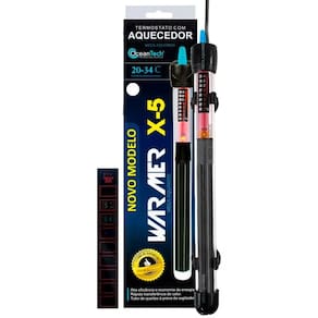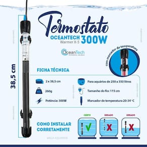 Termostato com aquecedor OceanTech 300W com marcação de temperatura lago ou aquário de até 350L - acompanha termômetro adesivo Para manter a temperatura estável e o bem-estar dos seus peixes, conte com o melhor equipamento do mercado, os termostatos com aquecedor OceanTech para aquários, são fabricados com materiais de alta qualidade, sua resistência é feita de puro níquel-cromo, que além de não enferrujar, possibilita rápida transferência de calor. Características: Resistência de puro níquel-cromo - não enferruja Tubo de quartzo de alta performance Painel de ajuste de temperatura Botão de controle de temperatura giratório Protetor plástico para a ponta Rápida transferência de calor Operação constante Totalmente submerso e à prova dágua Fácil instalação e manutenção Possui LED que indica quando o aquecedor está ligado Server para aquários de água doce ou marinhos Aquecedor e Termostato automático liga e desliga para atingir a temperatura regulada . Compre nesse anúncio diretamente com um revendedor oficial OceanTech. Especificações técnicas: Marca: OceanTech Modelo: Warmer X-5 Potência: 300W Ajuste de temperatura entre 20ºC a 34ºC Peso: 260g Tamanho: 2 x 38,5 cm larg x alt Tamanho do fio: 115cm Para aquários de 250 a 350 litros. Conteúdo da embalagem 1 termostato com aquecedor 1 protetor de plástico de ponta 2 ventosas para fixação 1 termômetro externo adesivo. Nota: Nunca ligue esse equipamento fora da água Se notar qualquer dano no cabo de energia, não utilizar o produto, pois haverá risco de choque elétrico. : 1 ano pelo fabricante, 3 meses pelo revendedor. apenas para defeito de fabricação. Dicas de uso: Use o termostato na vertical Instale-o em local onde há circulação de água Mantenha-o totalmente submerso Antes de ligar o equipamento, verifique a temperatura ideal para a espécie mantida no seu aquário Regular a temperatura desejada por meio do botão giratório. Como instalar o termostato Oceantech Limpe a parte de dentro do aquário onde será fixado o termostato Coloque na posição vertical e fixe com as ventosas no vidro Deixe-o aclimatando por cerca de 15min evitando choque térmico Ligue-o na tomada certifique-se que a voltagem do produto é a mesma da rede . Funcionamento: Sempre que o sensor do equipamento detectar na água uma temperatura abaixo do ajustado no painel, o aquecedor ligará automaticamente, e desligará quanto atingir a temperatura desejada. Manutenção: Realize a limpeza do termostato a cada 30 dias Sempre desligue o equipamento de 15 a 20 minutos antes de retirá-lo do aquário Lave-o em água corrente e não utilize produtos abrasivos. Serve para piscina Não serve. Serve para chocadeira Não serve. Serve para aqua-terrário Não serve. Posso colocar na horizontal O fabricante aconselha apenas uso na vertical. Obrigado pela visita e boas compras ATENÇÃO Nossas imagens e textos são registrados e com direito de uso autoral controlado e reservado a essa loja e as lojas parceiras devidamente autorizadas em contrato.