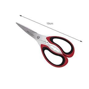 Tesoura culinária de metal com cabo plástico Cor: vermelho Tesoura com lâmina em aço inox para um desempenho de corte excepcional e duradoura, ainda possui cabo soft em plástico para um maior conforto evitando acidentes, e capa plástica protetora para as lâminas. As tesouras servem perfeitamente para destro ou canhoto. Lâminas altamente resistente à ferrugem e corrosão, de alta qualidade, precisas, afiadas e cuidadosamente ajustadas.