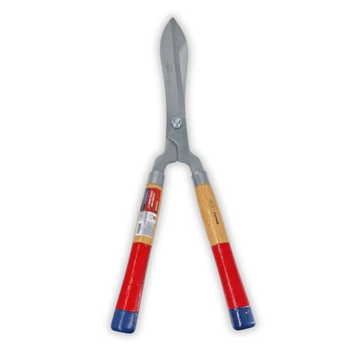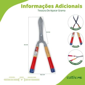 Características * Tipo: Tesoura para aparar grama * Marca: CORNETA * Tamanho: 12” * Material das lâminas: Aço carbono de alta resistência * Material do cabo: Madeira envernizada com pontas pintadas * Corte: Preciso * Uso indicado: Acabamento e arremate em gramados e jardins * Função: Corte manual de grama e vegetação rasteira