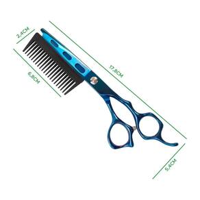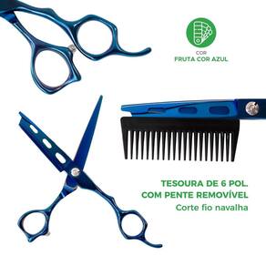 Tesoura de corte de cabelo com pente integrado, a ferramenta perfeita para um corte de cabelo preciso e eficiente em casa ou no salão. Com design ergonômico e lâminas afiadas em aço, essa tesoura oferece um corte suave e uniforme. Especificações Técnicas: - Pente Integrado - Lâminas de Aço - Fio navalha: possuem um corte convexo e extremamente afiado - Com parafuso ajustável - Design Ergonômico - Com apoio para os dedos - Cor: Azul vibrante com acabamento cromado - Versatilidade: e doméstico - Tamanho: 7 Polegadas - Dimensões pente: 2,4cm x 6,8cm - Dimensões tesoura: 5,4cm x 17,8cm Marca: Não Informado