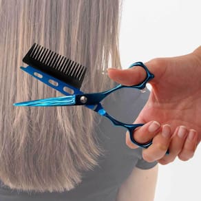 Tesoura de corte de cabelo com pente integrado, a ferramenta perfeita para um corte de cabelo preciso e eficiente em casa ou no salão. Com design ergonômico e lâminas afiadas em aço, essa tesoura oferece um corte suave e uniforme. Especificações Técnicas: - Pente Integrado - Lâminas de Aço - Fio navalha: possuem um corte convexo e extremamente afiado - Com parafuso ajustável - Design Ergonômico - Com apoio para os dedos - Cor: Azul vibrante com acabamento cromado - Versatilidade: e doméstico - Tamanho: 7 Polegadas - Dimensões pente: 2,4cm x 6,8cm - Dimensões tesoura: 5,4cm x 17,8cm Marca: Não Informado