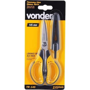 Conteúdo da embalagem: 1 Tesoura uso geral reta cabo plástico revestimento emborrachado TR145 Vonder