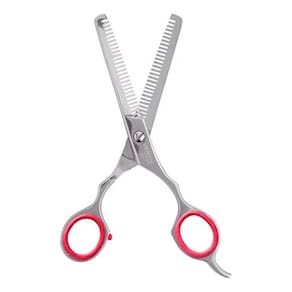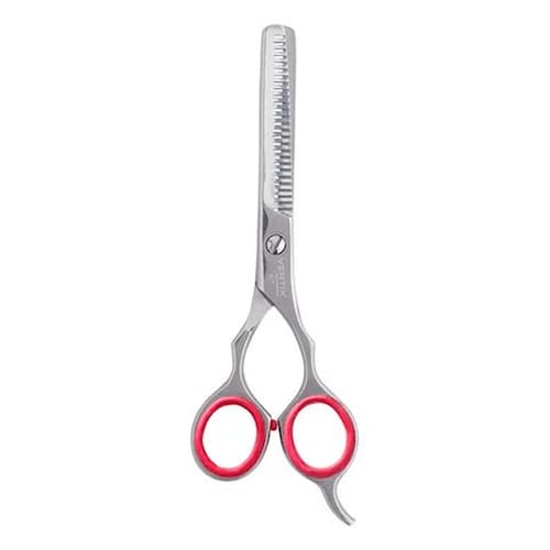 A Tesoura Vertix Red Circle Desbaste Duplo 6,0 com as duas lâminas dentadas ideal para desbastar e reduzir o volume dos cabelos ou até mesmo cortes de cabelo em degradê. O cabo possui apoio de dedo e amortecedor de impacto de silicone para maior conforto no manuseio e as lâminas possuem parafuso ajustável para determinar a melhor tensão de corte da tesoura.
