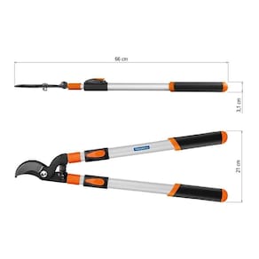 Lâminas em aço carbono temperado para um corte preciso e macio. Cabos metálicos extensíveis de 45 até 82 cm. Batente Emborrachado. Empunhaduras ergonômicas emborrachadas. Diâmetro de corte máximo admitido: 30 mm. profissional. Tecnologia Bypass (corte cruzado). Indicado para galhos verdes. Durante o corte, ocorre o cruzamento entre lâmina e contra-lâmina. Possibilita um corte preciso e sem rebarbas, que não deixa marcas no galho e facilita a cicatrização.