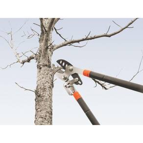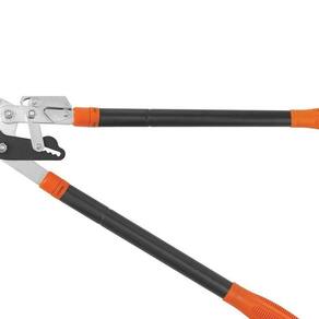 Resposta: Este tesourão possui lâmina tipo Anvil, ideal para galhos secos e duros, onde a lâmina corta contra uma base fixa. Pergunta: Qual o alcance máximo com os cabos extensíveis?