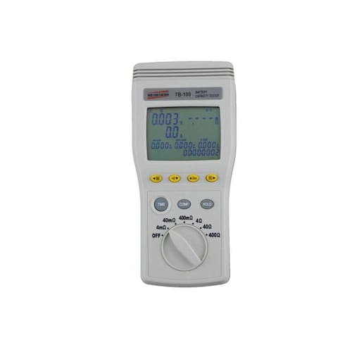 TESTADOR DA CAPACIDADE DE BATERIAS MOD. TB-100 DESCRIÇÃO: Testador da capacidade de baterias mod. tb-100 ESPECIFICAÇÕES TÉCNICAS: Mede a “vida útil real” da bateria (resistividade, voltagem, corrente e temperatura). Capacidade da bateria: 0 a 1200 Ah Resistência: Escala: , , ,, ,4mO 40mO 400mO 4O 40O 400O Resolução: , , , , ,1µO 10µO 100µO 1mO 10mO 100mO Precisão: ± (1% da leitura + 8 dígitos) Condições de Medições:-Corrente: 40mA, 4mA, 400µA, 40µA, 4µA Freqüência: 1kHz ± 30Hz Voltagem DC: Escala:6V; 60V Resolução:1mV; 10mV Precisão: ± (0,1% da leitura ± 6 dígitos) Temperatura Escala: -20ºC a 60ºC, -4ºF a 140ºF Resolução: 0,1ºC; 0,1ºF Precisão:± 1ºC; ± 1,8ºF Corrente DC Escala: 600A Resolução:0,01A ; 0,1A Precisão: ± (2% da leitura + 2 dígitos) Interface serial RS-232 Função datalogger Memória de dados manual: 999 conjuntos de dados Memória datalogger: 6000 dados Memória: 99 conjuntos de dados Ambiente de operação: 0ºC a 40ºC com 80% UR ou menos, sem condensação. Voltagem de entrada máxima: 60V DC Alimentação: 6 pilhas AA de 1,5V Alcalinas Dimensões: Aprox. 200 x 95 x 50 mm Peso: 530g Fornecido: Ponta de prova tipo clip com sensor de temperatura Ponta de prova tipo pino Adaptador de corrente Placa de ajuste de zero Cabo RS-232 Software Pilhas Adaptador AC Estojo para transporte Manual de instruções