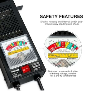 NEIKO Testador de bateria de carro 40510A | Verificador de carga automotiva de 100 AMP 6 e 12 volts | Analisador CCA - [Conveniente]: Seja para casa, garagem ou na loja, o testador de carga de bateria Neiko é portátil e compatível com DIY para diagnosticar e aplicar carga em carro, van, barco, caminhão, SUV, motocicleta, RV e outras baterias automotivas de 6 e 12 volts. - [Qualidade]: O corpo do testador possui visor de medidor de tensão analógico revestido de proteção, interruptor interno anti-faíscas e alça externa na parte superior para transporte portátil. - [Durável]: Os conectores de grampo de cobre apresentam alças de borracha vermelha positiva e negativa preta para designar facilmente a colocação do clipe de teste nos terminais da bateria. - [PERFEITO PARA MECÂNICA]: A carga no interruptor de teste (mantém a carga por no máximo 10 segundos) consome a corrente da bateria para simular o consumo do motor de partida para determinar a condição da bateria com precisão e facilidade de leitura. - [Precisão]: Especificações técnicas: Corrente de carga fixa de 100 AMP, teste de carga de 100 AMP para baterias de 12 V até 1000 amplificadores de manivela fria, teste de carga de 50 AMP para baterias de 6 V até 1000 CCA. Precisão de tensão de ± 0,2V.