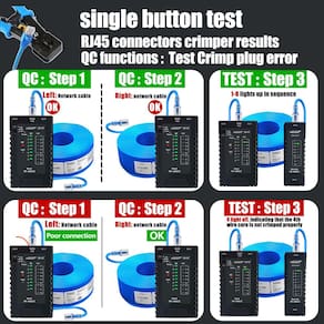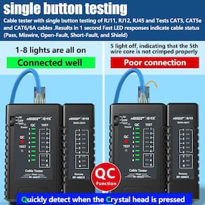 - 🚩?FUNÇÃO DE CONTROLE DE QUALIDADE?:testador cat 5 Resultados rápidos do teste (circuito aberto, cruzado, direto, curto-circuito), detectam rapidamente a condição de crimpagem da cabeça de cristal. Cabos de rede blindados especiais também podem ser medidos (UTP/STP).