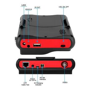 Aplicação: testador de cabos utp/lan, para medir o status da conexão, e exibir a sequência de conexão , osd multilíngue e teste de áudio, suporte 12 idiomas para escolha, brilho e contraste e saturação de cor podem ser ajustados, interface usb 2.0 fornece 5v/1a saída de energia de emergência, alimente a câmera com saída de energia dc 12v/1a do testador.