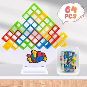 Jogo Tetra Tower Stack Attack — 64 unidades com caixa de armazenamento: jogo Team Tower para crianças e adultos, jogo de festa em família, jogos de tabuleiro, balanceamento, brinquedos para 2 a 6 jogadores