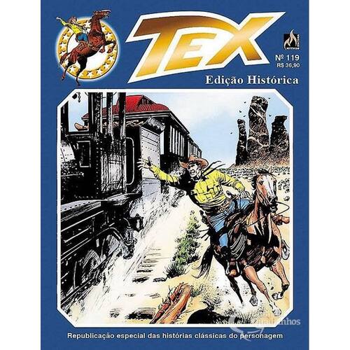 Tex edição histórica Nº 119: Trilhos de sangue Tex edição histórica Nº 119 Trilhos de sangue Duas companhias ferroviárias, a Western Pacific e a South & West, estão disputando para ver quem vai construir um trecho de ferrovia que irá do Arizona até São Francisco, na Califórnia. Os desonestos proprietários da Western Pacific contratam o patife Rob Brent para sabotar seus rivais da South & West, que já estão bem adiantados nos trabalhos. Depois de sofrer vários ataques aos trens e aos canteiros de obras, o inspetor geral da South & West, pede ajuda ao Exército e a Tex e Carson para tentarem investigar e deter os responsáveis elos ataques. Brent e seus asseclas têm o apoio do comerciante Simon, um contrabandista, e Tex e Carson contam com a ajuda dos apaches do chefe Cochise, que inclusive permite que seu filho Tazay acompanhe os dois justiceiros. Marca: Não Informado