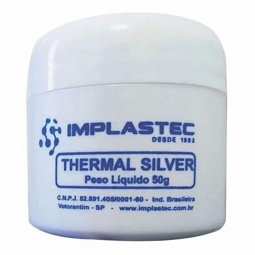PASTA TÉRMICA COM PRATA 1. Descrição A Pasta Térmica Thermal Silver é formulada a partir da conveniente aditivação de silicone modificado com materiais especiais, de alta condução térmica, conferindo a este produto um desempenho superior em dissipação de calor. Com alta condução térmica (1,2 W/mK) e sua facilidade de espalhamento, a Pasta Térmica Thermal Silver recobre totalmente as superfícies térmicas, preenche todas as micro lacunas entre as superfícies, eliminando o ar retido e oferecendo resistência térmica muito baixa. A Thermal Silver é quimicamente inerte, não corrosiva e atóxica, além de possuir excelente estabilidade térmica, podendo operar sem perder suas principais propriedades em temperaturas de até 250 C e, por curtos períodos, temperaturas de até 300 C. Possui em sua composição o excelente aditivo de prata coloidal. Principais Aplicações A Thermal Silver é especialmente indicada para uso onde haja necessidade de eliminação de calor de modo mais eficiente que as pastas térmicas comuns, como em CPUs, processadores de alta performance, fontes geradoras de calor, termopares, resistências, montagens de semicondutores e demais componentes.