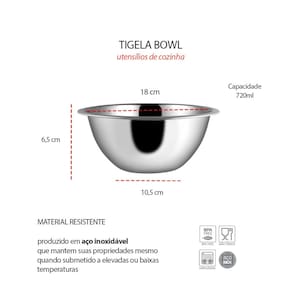 Tigela Bowl Inox. Essa cumbuca é otima para preparar, misturar e servir. As tigelas sao produzidos inteiramente em aço inoxidavel de qualidade. O bowl é uma peça multifuncional, a tigela pode ser usada para cereais, sopas, caldos quentes ou frios, porçoes individuais de salada e ate para servir petiscos. Contem: 1 Tigela Bowl Capacidade: 720 ml Medidas: 18 x 6,5 cm Material: Aço inoxidavel Casacha é uma loja especializada utensilios de cozinha