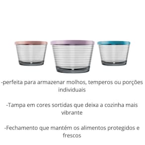 A Tigela de Vidro Ginga 145ml com Tampa Cor é a escolha ideal para armazenar pequenas porções com praticidade e estilo. Com capacidade de 145ml, é perfeita para servir molhos, patês, sobremesas individuais, temperos ou snacks, mantendo os alimentos frescos por mais tempo. Produzida em vidro resistente e higiênico, não retém odores nem manchas, garantindo maior durabilidade e preservação da qualidade. A tampa colorida e funcional assegura um fechamento eficiente, evitando vazamentos e facilitando o transporte. Compacta e versátil, é ideal para uso diário, organização e praticidade na cozinha. Especificações: - Marca: Nadir; - Modelo: 3256; - Com Tampa: Sim; - Capacidade: 145ml; - Diâmetro: 6,5 cm; - Dimensões: 8 x 8 x 6 cm; - Material: Vidro, Plástico; - Recomendações: A tampa não deve ser exposta a altas temperaturas forno ou micro-ondas ; - : 3 meses 90 dias . Conteúdo da embalagem: -01 Tigela de Vidro Ginga 145ml com Tampa Cor . Marca: Não Informado