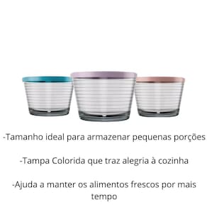 A Tigela de Vidro Ginga 350ml com Tampa Cor é perfeita para quem busca praticidade e organização na cozinha. Com capacidade de 350ml, é ideal para armazenar porções de sobremesas, frutas, molhos, temperos ou pequenos lanches, preservando o frescor dos alimentos por mais tempo. Produzida em vidro resistente e higiênico, não absorve odores nem manchas, mantendo a qualidade dos alimentos. A tampa colorida e funcional garante vedação eficiente, evitando vazamentos e facilitando o transporte. Compacta e versátil, é ideal para o dia a dia, oferecendo durabilidade, estilo e comodidade em um só produto. Especificações: - Marca: Nadir; - Modelo: 3255; - Com Tampa: Sim; - Capacidade: 350ml; - Diâmetro: 9 cm; - Dimensões: 10,5 x 10,5 x 7 cm; - Material: Vidro, Plástico; - Recomendações: A tampa não deve ser exposta a altas temperaturas forno ou micro-ondas ; - : 3 meses 90 dias . Conteúdo da embalagem: -01 Tigela de Vidro Ginga 350ml com Tampa Cor . Marca: Não Informado
