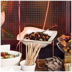 A Tigela Quadrada New Wave da Villeroy Boch é perfeita para servir pratos menores, como sopas, saladas ou sobremesas, com estilo e elegância no dia a dia. Seu formato profundo também a torna ideal para ensopados e acompanhamentos. Com um design moderno e ergonômico, a tigela é empilhável e possui bordas resistentes a choques e impactos, sendo adequada para serviços de catering. A porcelana branca leitosa, com suas linhas fluidas e bordas curvas, destaca perfeitamente os alimentos ou bebidas servidos. Com dimensões de 33 x 33 cm e 8,5 cm de altura, a tigela apresenta curvas estéticas que criam uma sensação de movimento quando vistas de todos os ângulos. Feita de porcelana vitrificada com esmalte resistente a lascas, é durável e pode ser lavada na máquina de lavar louça, no micro-ondas e em fornos de até 200 °C. A Tigela Quadrada New Wave é uma peça de louça magnífica que traz distinção a qualquer refeição!