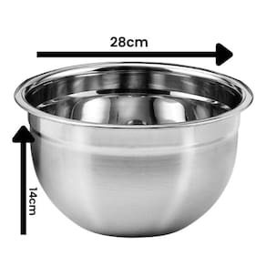 Este elegante bowl de aço inox é o aliado perfeito para sua cozinha Com 28cm de circunferência e 14cm de profundidade, ele oferece espaço amplo para preparar suas massas de bolo favoritas, criar saladas frescas ou armazenar alimentos com praticidade e estilo.