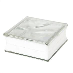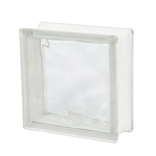 O bloco de vidro é incolor, com acabamento transparente e ondulações em ambas as superfícies.