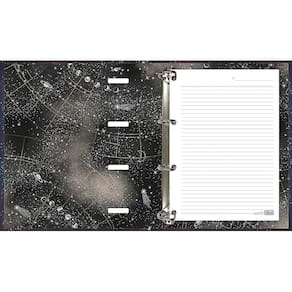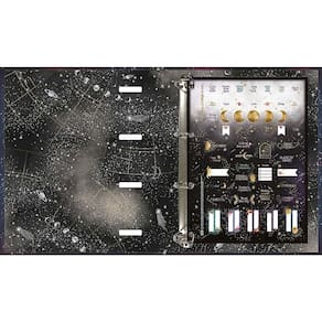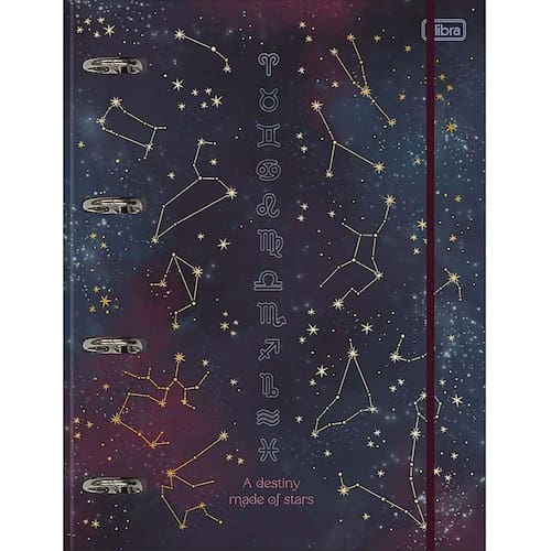 O Caderno Argolado Cartonado Universitário com Elástico Magic tem 80 folhas, adesivos e bolsa plástica. A linha nasceu para atender ao fascínio que milhares de pessoas têm por astros, estrelas, signos e elementos do espaço.
