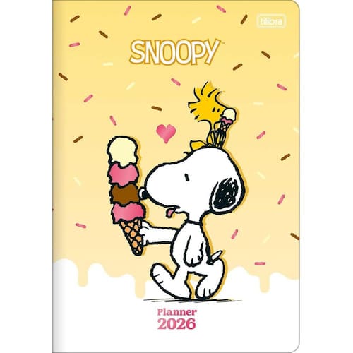 Se você busca um produto inspirado no beagle mais querido dos desenhos animados, o planner grampeado Snoopy da Tilibra é a escolha perfeita. O produto tem tamanho 17,8 x 25,4 cm, capa flexível com detalhes metalizados e folhas com visões anual e mensal. Este planner 2026, que possui 20 folhas em papel creme, com gramatura de 90 g/m², é escolha ideal para anotações objetivas.