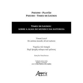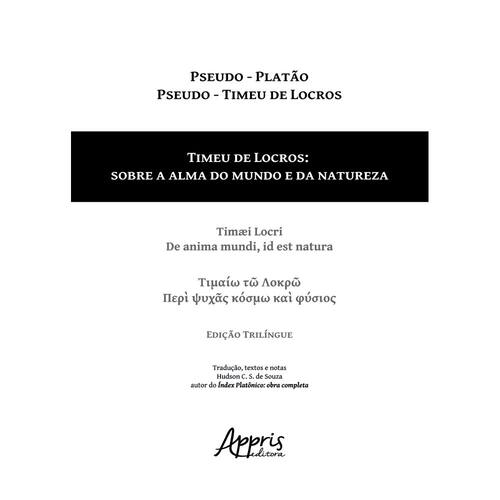 Timeu de Locros era, até então, a única obra do Corpus Platonicum ainda sem tradução para o português. De autoria controversa, o tratado sobre cosmologia foi atribuído tanto ao próprio Timeu de Locros (filósofo e matemático pitagórico do séc. V a.C.) como ao notório filósofo grego Platão (séc. IV a.C.), uma vez que Timeu de Locros foi personagem em dois de seus diálogos, inclusive, um deles intitulado com o seu nome: Timeu. As querelas acerca da autenticidade se prolongaram até o séc. XVII, quando então a obra foi considerada definitivamente apócrifa para ambos os autores, como também, possivelmente, nem mesmo escrita por um filósofo da antiguidade. Estudos posteriores situaram o trabalho como supostamente originário da Alexandria, redigido entre I a.C. e I d.C. Assim, tão logo considerada espúria, a obra foi progressivamente sendo "esquecida", até não mais integrar, desde o início do século XX, as "obras completas" de Platão. O escrito representa uma retomada da cosmologia platônica e pós-platônica, inclusive com influência aristotélica, cujo interesse é partilhado tanto por estudiosos como interessados em geral em filosofia, cosmologia e religião antiga.