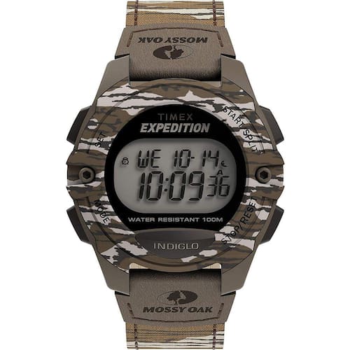 Um amor genuíno pela relojoaria encontra um amor genuíno do grande ao ar livre. Construída para qualquer aventura, esta atualização para o nosso bem elaborado relógio Expedition Full Size Digital CAT tem uma caixa marrom robusta com um anel superior camuflado e alça de tecido com um padrão de camuflagem assi Mossy Oak, líderes em camuflagem e estilo de vida ao ar livre. As características incluem um cronógrafo, 3 alarmes, temporizador, luz de fundo INDIGLO e é resistente à água até 100 metros.