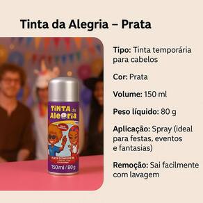 Transforme o visual de forma rápida e divertida com a Tinta Da Alegria Sua fórmula temporária em spray colore os cabelos com praticidade, sendo perfeita para festas, fantasias, eventos escolares, carnaval e diversas comemorações. Tipo: Tinta temporária para cabelos Cor: Prata Volume: 150 ml Peso líquido: 80 g Aplicação: Spray - fácil de usar Indicação: Ideal para festas, eventos e fantasias Remoção: Sai facilmente com água e shampoo Marca: Não Informado Ean: 7898233932143
