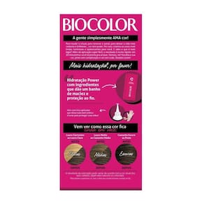 Biocolor Creme (50g): Aqua, Cetearyl Alcohol, Oleic Acid, Ammonium Hydroxide, Ethanolamine, Glyceryl Stearate, Propylene Glycol, Parfum, P-Phenylenediamine, Resorcinol, Dicaprylyl Ether, Ceteareth-20, Lauryl Alcohol, entre outros.