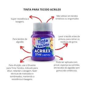 MARCA: ACRILEXMODO DE USAR:Pode ser aplicada com pincel, esponja ou carimbo, em tecidos de algodão sem goma (não sintéticos).Lavar o tecido antes da pintura, para retirar os resíduos de goma.Após a pintura, aguarde 72 horas para lavagem.DILUENTE:Para diluição, use o Diluente para Tinta Tecidos, indicado para diluir, retardar a secagem, fazer técnicas de matizados e sombreados, mantendo a resistência à lavagens.
