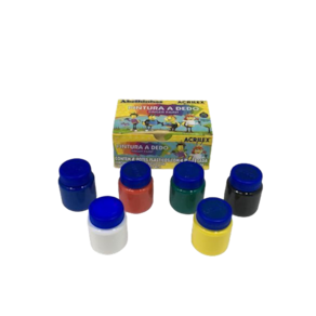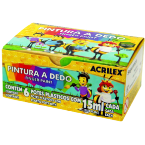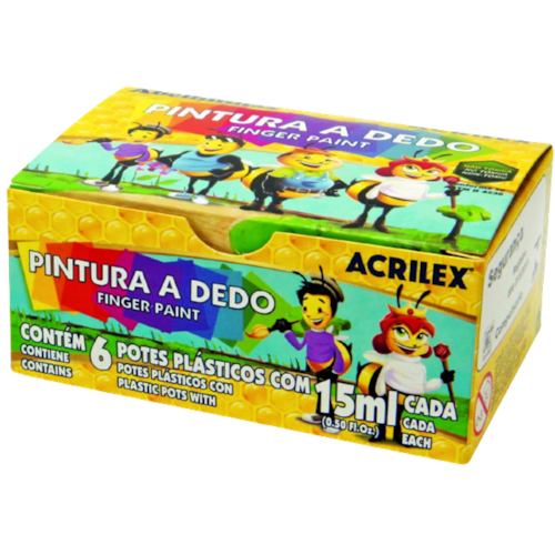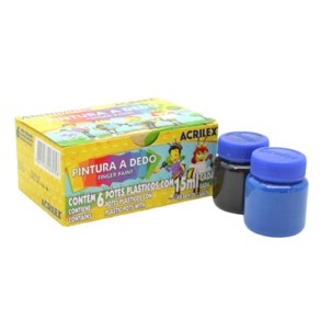 inta ideal para atividades com as mãos. Aumenta o desenvolvimento da percepção tátil e da coordenação motora. Pintura a Dedo Acrilex Contém: 6 cores em potinhos plásticos de 15ml cada