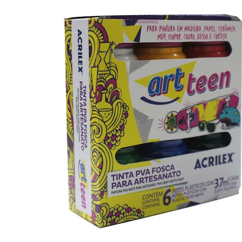 Tinta Pva Fosca Estojo Com 6 Cores 37Ml PVA Tinta Fosca Para Artesanato 37ml. A base de Látex P.V.A. Secagem rápida. Acabamento fosco. Pronta para uso. Pode ser aplicada com pincel, esponja ou rolinho de espuma. Diluente: Água, Gel para Matizar, Médium Acrílico, Verniz Acrílico, Lacas, Acrilfix e Base Acrílica para Artesanato. Ideal para trabalhos artesanais sobre madeira, gesso, MDF, cerâmica, cortiça, isopor, papel, palha e PET preparado antes com Primer Acrilex . Cor: 6 cores Marca: Não Informado Ean: 7891153002996