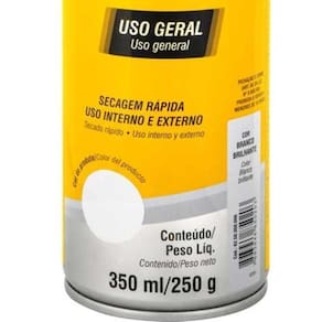 Cod. Fornecedor: 6250350006Marca: Vonder Conteúdo da embalagem: 1 Tinta em spray com 350 ml / 250 g.Destaques e diferenciais: Ótima resistência às intempéries e secagem rápida. Proporciona excelente acabamento, poder de cobertura e alto rendimento.Aplicações e dicas de uso: Indicada para pinturas em geral, uso interno e externo. Tinta base acrílica. legal: 90 diasQualificação TécnicaCor: Branco Acabamento da tinta: Brilhante Tipo de base da tinta: Base acrílica Volume ml/g : 350 ml / 250 g Massa aproximada peso kg : 0,250 kg Marca: Não Informado