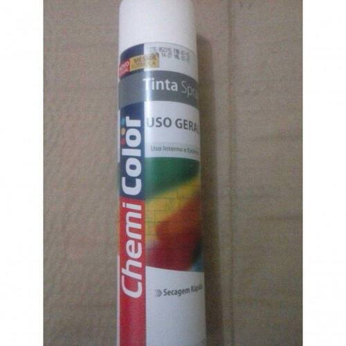 Tinta Spray Chemicolor Brilhante Branco 400ml ChemiColor: Uso Geral - Tinta Spray 400mlTinta aerossol elaborada com produtos de alta qualidade, indicada e aprovada para uso no mais diversos tipos de pintura. Tinta Chemicolor Uso Geral garante uma boa cobertura, com alto rendimento.Cores Alumínio Aluminio Rodas Amarelo Azul Claro Azul Escuro Bege Branco Brilhante Branco Fosco Dourado Fundo Grafite Laranja Marrom Preto Brilhante Preto Fosco Rosa Verde Claro Verde Escuro Vermelho Verniz Violeta Claro Violeta Escuro INSTRUÇÕES DE USO:Preparo da superfície - deve-se limpar bem e lixar (se necessário) a parte a ser aplicada, retirando impurezas (pó, ceras, gorduras, óleos, etc) e resíduos existentes. Pode-se aplicar algum tipo de selante ou primer existente no mercado, para maior uniformidade na aplicação. Aplicação - agite bem a lata antes usar, faça um pequeno teste do aplicador, pressionado a válvula algumas vezes em qualquer superfície, verificando o formato do jato. Pulverize a uma distância de 10cm do local, utilizando-se de movimentos uniformes cobrindo a área desejada. Para melhor cobertura, aplique várias demãos com intervalos regulares entre as mesmas.CUIDADOS:Em dias de muito frio, recomenda-se deixar as peças a serem pintadas no sol, antes da pintura. Não realizar a aplicação em locais fechados ou sem circulação de ar. Em plásticos e acrílicos, fazer um teste em uma pequena área, para verificar a compatibilidade e secagem do produto. Após a utilização vire o frasco de cabeça para baixo e pressione a válvula até que se note somente a saída de gás, isto evitará possíveis entupimentos. Em caso de entupimentos mergulhe o bico aplicador em algum tipo de solvente.PRECAUÇÕES:Conteúdo sob pressão. Não perfurar a embalagem, mesmo vazia. Não jogar no fogo ou incinerar. Cuidado inflamável. Manter longe de chamas ou superfícies aquecidas. Não expor à temperaturas superior a 50C. Não inalar, não deixar em contato com a pele ou olhos. Em contato com os olhos e a pele, lavar com água. Não inalar. Se ingerido, não provocar vômito, e consultar de imediato o Serviço de saúde mais próximo ou o Centro de Informações Toxicológicas. CIT/RS 0800 721 3000.ApresentaçãoConteúdo: 400ml / 250gApresentação: Aerossol