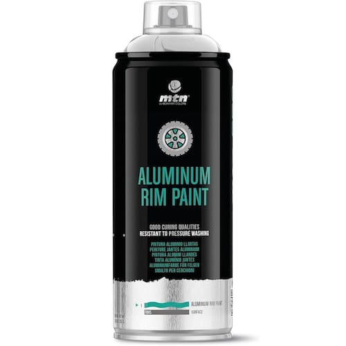 Tinta Spray Para Aros e Rodas Aluminum Rims 400ml PRO MTN Esmalte acrílico termoplástico de secagem muito rápida formulado com resinas de altíssima qualidade para dar uma aparência renovada aos aros de automóveis ou onde seja necessário um acabamento de alta qualidade semelhante ao alumínio.