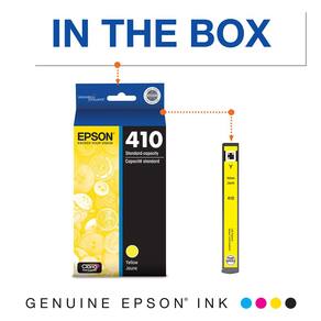 Print stunning photos and professional-quality documents with this Epson T410 yellow ink cartridge. Enjoy vibrant print quality for all of your photo and document needs with this yellow ink cartridge. The cartridge offers a standard page yield, so your printer can keep up with daily printing tasks. This Epson 410 cartridge uses high-quality ink to deliver bold and lasting yellow hues. Contains one 410 Yellow Ink Cartridge. See below for a list of compatible machines. - Smudge and scratch resistant photos - Water resistant photos