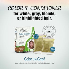 The Light Mountain Naturals Color the Gray Kit contains everything you need to add lustrous color to your hair while restoring body and shine.