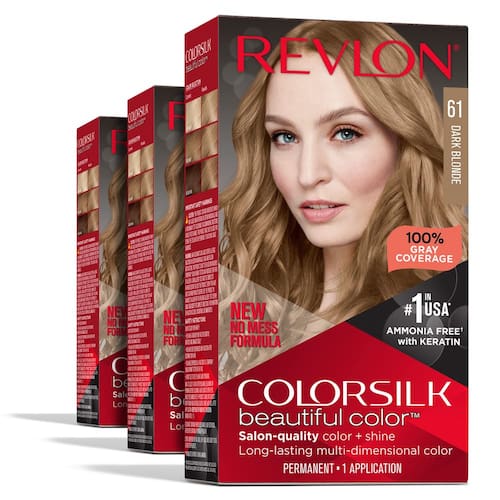 Cor permanente de cabelo Revlon, tintura de cabelo loiro permanente, seda colorida com cobertura 100% cinza, sem amônia, queratina e aminoácidos, tons de loiro (pacote com 3)