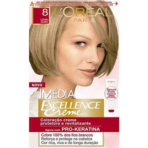 É a coloração que proporciona 100% de cobertura dos brancos e cabelos 85% mais resistentes. Coloração Imédia Excellence Creme N°8 Louro Claro proporciona cobertura completa dos fios. Sua tecnologia avançada protege e cuida dos cabelos antes, durante e depois da coloração, com até 6 semanas de tratamento condicionador intenso.Modo de usar: Coloque a tinta no frasco aplicador e agite bem até ficar homogêneo. Separe o cabelo e aplique da raiz as pontas e espalhe uniformemente em todo o cabelo (aplique a tinta com o cabelo seco). Retire o produto após 35 ou 40 minutos da aplicação.Indicação: Para cabelo curto usar somente 1 Caixinha, para cabelo longo utilizar 2 caixinhas.