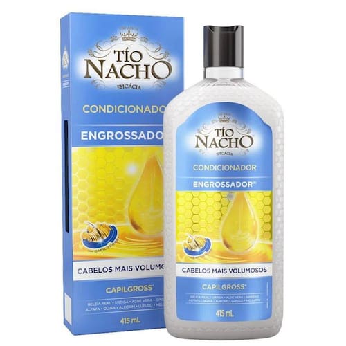 O Condicionador Tío Nacho® Engrossador demonstrou clinicamente sua eficácia para conseguir um CABELO COM MAIS VOLUME. Com sua exclusiva combinação de GELEIA REAL COM CAPILGROSS e extratos de origem natural, aumenta a espessura do cabelo e EVITA A QUEDA POR QUEBRA, para um cabelo mais forte, volumoso e saudável. - Aumenta a espessura do fio, nutrindo e fortalecendo de dentro para fora, proporcionando mais volume ao cabelo.