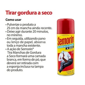 Bem vindo a a empresa redommaNossos produtos são recém-fabricadosTudo com garantia e documentos fiscaisSobre o produtoCaracterísticasAgite antes de usarTira manchas de gordura à secoEste produto foi elaborado especialmente com uma moderna fórmula, para eliminar manchas de gordura à seco de tecidos, roupas, estofados, carpetes, etc. Desenvolvida exlusivamente para tecidos.Modo de usar:1 - consulte sempre as instruções de lavagem indicadas nas etiquetasDas roupas.2 - pulverize semorin, aproximadamente a 25cm da mancha ainda recente.3 - deixe agir durante 20 minutos no mínimo.4 - em seguida, utilizando pano ou lenço de papel, absorva toda a mancha existente.5 - a ação de semorin irá formar uma camada branca, em forma de pó que deverá ser retirada com a esponja inclusa na tampa.Repita a operação se a mancha não desaparecer inteiramente.Observações:Não use o produto sem antes agitar vigorosamente o frasco. Após o uso, virar o frasco de cabeça para baixo e pressionar à válvula por 1 segundo para desobstruí-la. Se o bico entupir, coloque-o em água morna por 3 minutos. Fazer um teste de resistência da cor em local do tecido que não esteja a vista. Não utilizar semorin sobre tecidos impermeáveis, de borracha e popeline.Fotos meramente ilustrativasTire todas as suas dúvidas antes da compraCompre já.