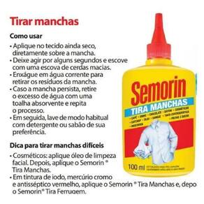 Modo de Uso: Aplique o Semorin Tira Manchas diretamente sobre a mancha. Deixe agir por alguns minutos não deixe secar no tecido . Lave a peça normalmente com sabão.