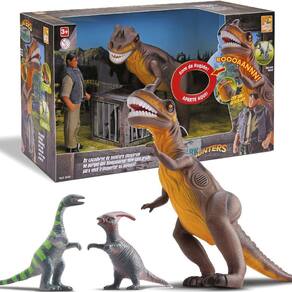 Dinopark Hunter Com Boneco - Bee Toys Os Caçadores de aventuras chegaram no parque dos dinossauros. Vem com grade para você transportar os animais, você aperta as costas dele e ele da um rugido Todo articulado com som e em vinil atóxico. Vem com dois mini dinossauros. Uma coleção de lindos dinossauros para você colecionar e curtir essa aventura.