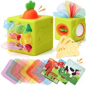Feitos de silicone que não pode ser mastigado, esses brinquedos de causa e efeito simulam a verdadeira alegria de puxar lenços de uma forma segura, sem bagunça e infinitamente divertida.
