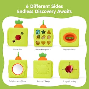 -?Aprendizado 6 em 1 inspirado em Montessori?Cada lado oferece uma nova aventura para despertar a curiosidade: fenda para puxar lenços, empurrar e estourar cenouras, grande abertura de carregamento, orifícios moldados, ovelha texturizada e um espelho seguro para bebês. O conjunto também possui um mordedor de coelho de silicone com bolhas pressionáveis para aliviar a dentição e divertir os dedos. Incentiva o jogo independente, fortalece as habilidades motoras finas e apoia o aprendizado precoce, como permanência de objetos, exploração sensorial e reconhecimento visual.